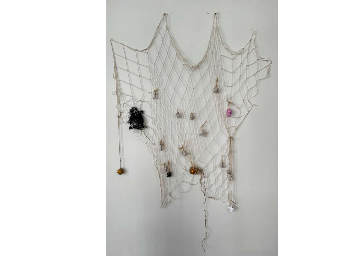 Bu eser ağ üzerine seramik, ip ve tül gibi farklı malzemelerin farklı disiplinlerle sanatçının
